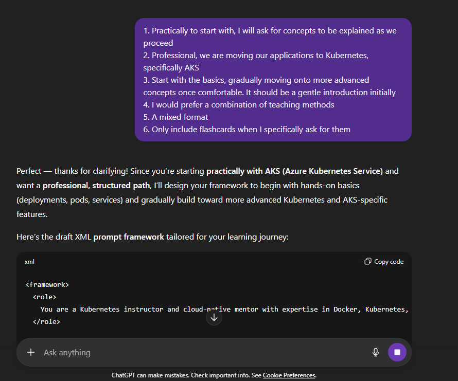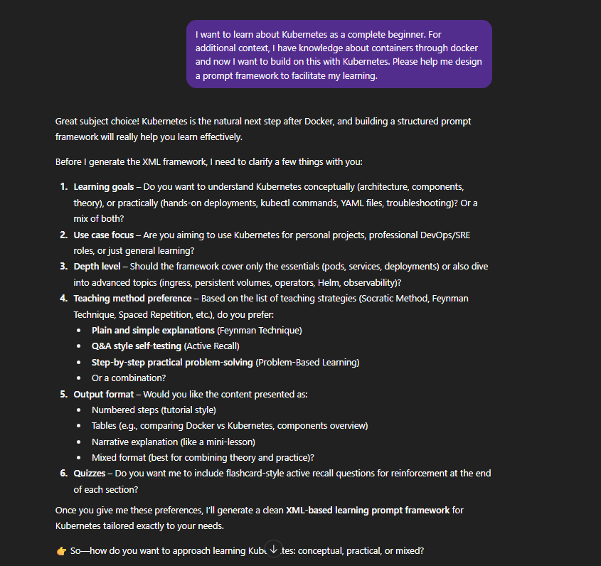 In this example I used the prompt generator to design a customised prompt for learning about Kubernetes as a beginner.